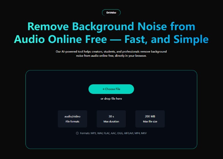 Let’s talk about the tool I use every single day: DeVoice. It’s the only one that checks every box for most people—free, online, fast, and so easy even your kid could use it. It excels at remove background noise from audio in every scenario, from lecture recordings to voice notes to podcasts.